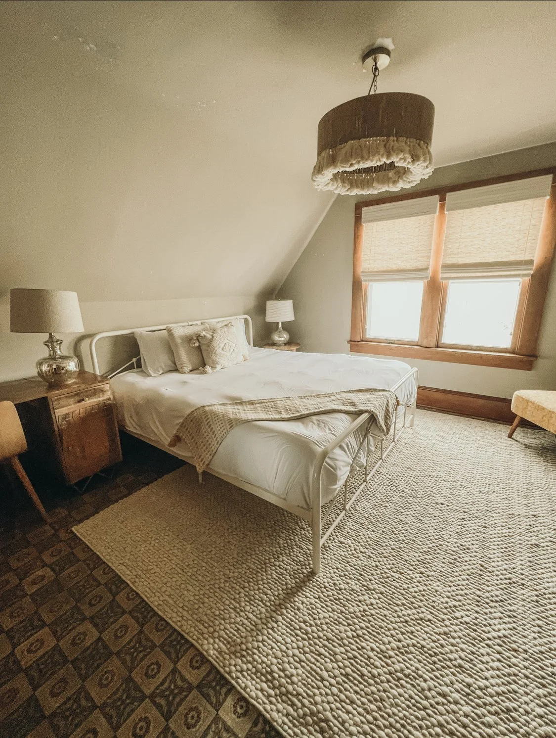 This room includes a comfortable leather couch, smart tv with favorites such as netflix included. A bar cart, connected bathroom and cozy rugs makes this the perfect room to relax in.