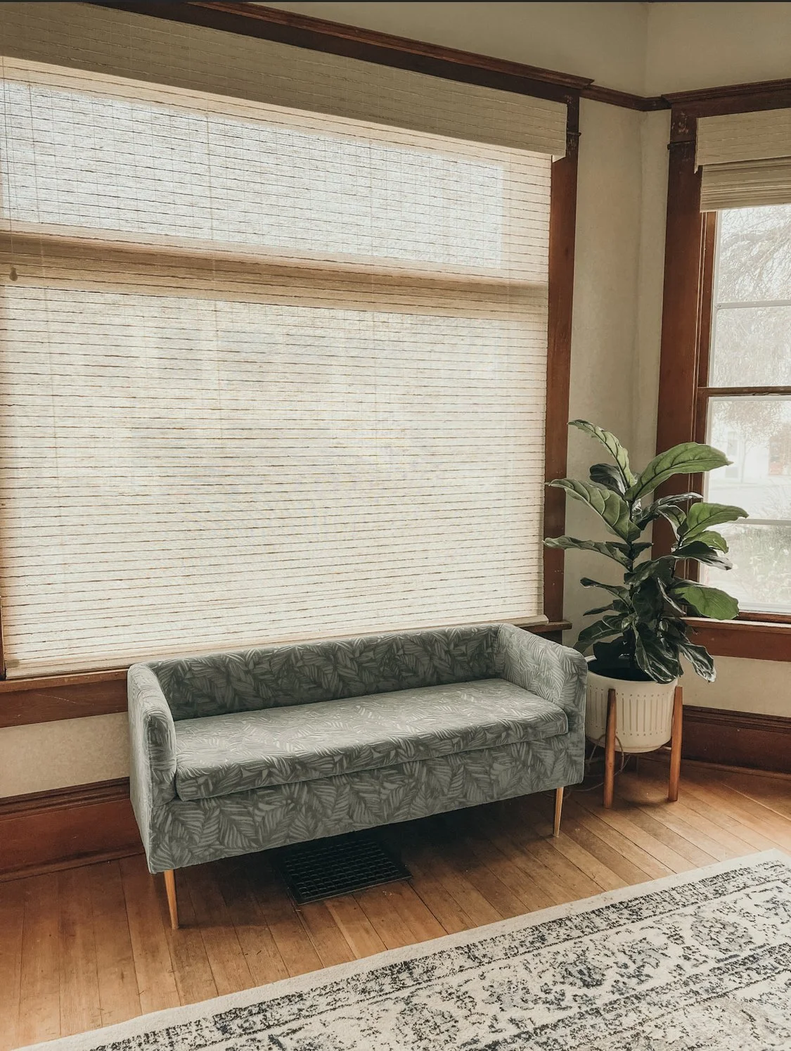The main living area features large windows with plenty of natural light, a unique sofa with two arm chairs and a wood burning fireplace.